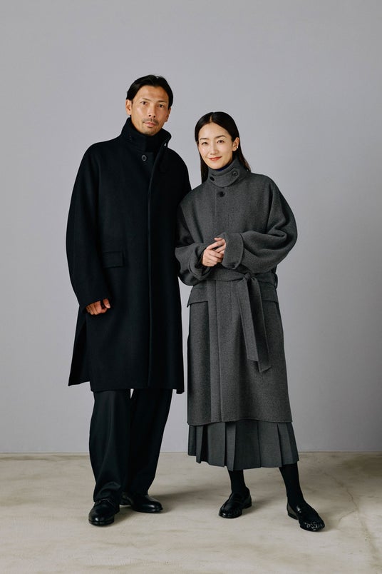デザイナーに森下公則氏を迎え、本格的なテーラリング技術とジェンダーフリーなパターン設計技術を融合。「所有から共有へ」という価値観の変化に寄り添い、夫婦やパートナー間で上質な一着をシェアする、サステナブルかつ合理的なライフスタイルを提案します。