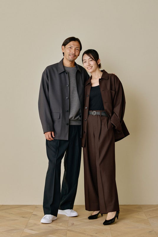 コンテンツには、元サッカー日本代表の鈴木隆行氏とモデルの橋本優子氏ご夫妻を起用し、「夫婦・家族間で共有できる」というソージュkのコンセプトを体現いただきました。「スーパー140メルトンバルマカーンコート」や「ウールツイルカバーオール」など 、共通のアイテムをそれぞれ着こなすことで、洗練された大人のペアスタイルを提示しています。
