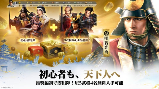 サーバーオープン後にゲームを始めた全プレイヤーへ、星5武将「蜂須賀小六」を無料配布。初心者の方でも序盤から戦力を整えられます。
