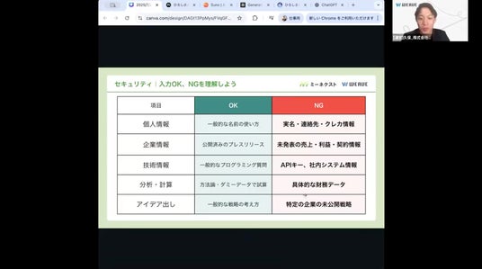 最後に実施したのは、生成AIを安全に活用するためのセキュリティ講座です。入力してよい情報と避けるべき情報を具体例で紹介し、実名・連絡先・社内情報などの取り扱いに注意が必要であることを解説しました。また、学校生活アンケートを題材にしたケーススタディでは、「個人名を削除し自由記述のみを入力する」という適切な方法を検討。参加者は実際に判断しながら「なるほど、こうすれば安心できる」と納得の表情が見られました。