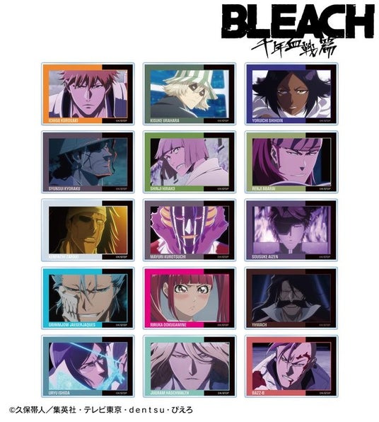 黒崎一護、浦原喜助、四楓院夜一、京楽春水、平子真子、阿散井恋次、更木剣八、涅マユリ、藍染惣右介、グリムジョー・ジャガージャック、毒ヶ峰リルカ、ユーハバッハ、石田雨竜、ユーグラム・ハッシュヴァルト、バズビーの印象的なシーンをアクリルカードに仕上げました。