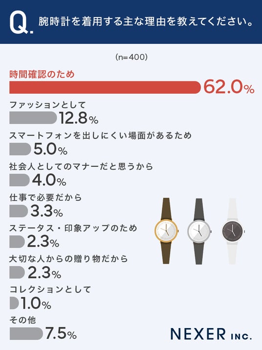 また、着用する理由については62.0%が「時間確認のため」と回答した一方で、デザイン性やファッション性を重視する声も多く見られます。