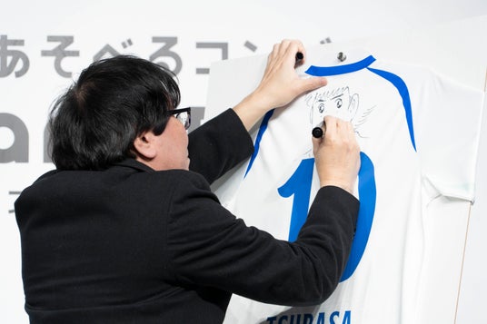 高橋先生には、南葛SCユニフォームの背中に、大空翼とファミリーマートのロゴの特別バージョンをライブドローイングいただきました。松平健さんはおなじみの「マツケンサンバII」を披露いただき、吉田さん・八木さんとともに会場全体が一体となって盛り上がりました。