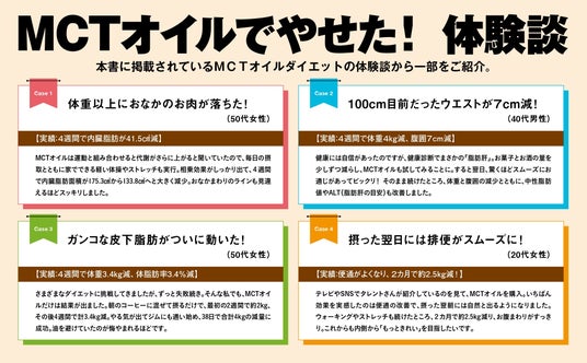 「4週間で体重が4kg減!腹囲が7cm減!」など、MCTオイルの摂取を実践して、うれしいダイエット効果、便秘改善効果を得た体験談が本誌に続々と集まりました。