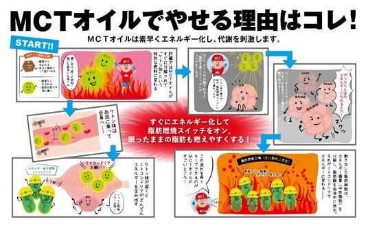 そして、すでについている体脂肪にも作用し、エネルギー化しやすくする働きももっています。さらに、吸収されたMCTオイルの一部は、腸を動かすホルモン「グレリン」の働きを助け、排便を促し、吸収されなかった一部のMCTオイルは、大腸で潤滑油として作用。便のすべりをよくすることも明らかになっています。