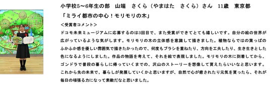 1.「第24回ドコモ未来ミュージアム」について「ドコモ未来ミュージアム」は、未来をつくる子どもたちの夢や未来を応援するため、ドコモが2002年から毎年開催している創作絵画コンクールです。本コンクールでは、例年子どもならではの自由な発想による、明るい未来や夢を描いた作品が多く応募されますが、今年は特に、地球とそこに暮らす仲間たちを愛おしく大切に思う気持ちがあふれる作品や、社会にあるさまざまな課題を優しい気持ちとコミュニケーションの力で解決に導くような作品が多く集まりました。
