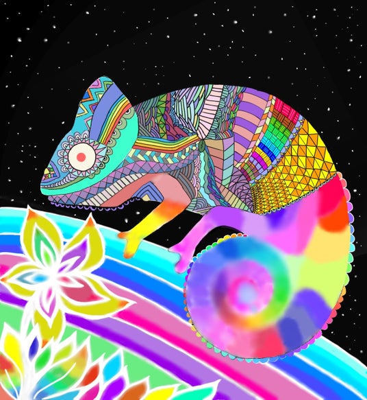 孤独から抜け出し世界で混ざり合う様子を多様性と言う意味のカメレオンや背景を使って表現した。今は、国や地域、性、宗教で明確な区切りがあるが、未来になるにつれ人々が共存していってほしいという願いを込めた。