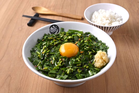 濃厚な鶏豚骨スープに、香味ごま油をまとった旨ニラとシャキシャキ生ニラを半束分たっぷりとトッピング。中央には卵黄、サイドには刻みにんにくを添えたパンチの効いた一杯です。卵黄を崩して混ぜれば、香り・旨味・コクが最高潮に!最後は、旨味が凝縮したスープに"禁断の〆めし"を入れて「ニラタマニンニクおじや」(写真左)にして、一食で二度美味しい、多幸感MAXの一杯を楽しめます。