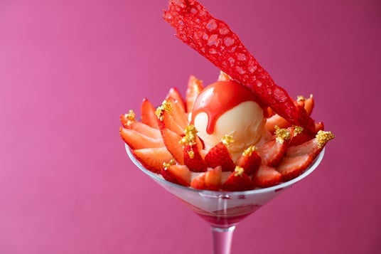 グラスの中にみずみずしいフレッシュの苺とふわっと軽い生クリーム、バニラアイスクリームが層をなし、仕上げには甘酸っぱいストロベリーソースがトロリ。見た目も味も贅沢な一品。