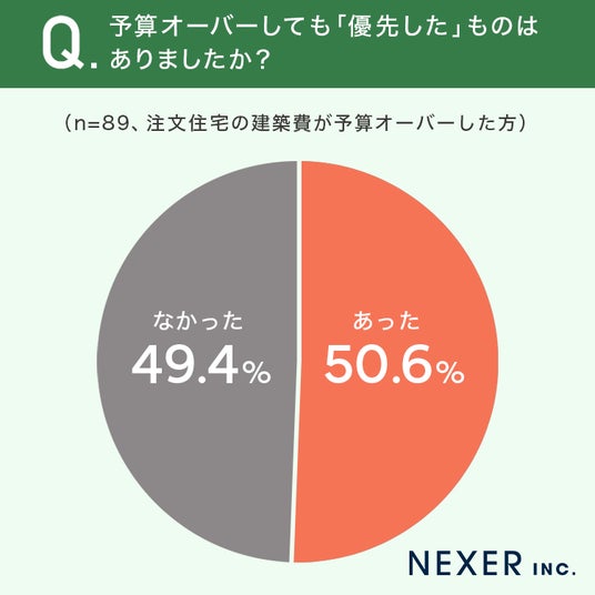 2人に1人が「優先したものがあった」と回答しました。予算を超えてもなお、「譲れないこだわり」が存在し、それを実現するために追加費用を許容した、施主の強い意志を反映しています。