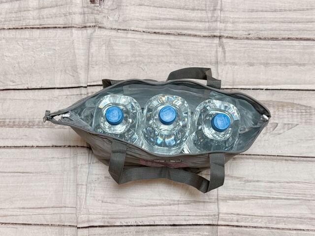 2Lペットボトルを横に倒して収納できる幅で、立てて入れるとファスナーは閉まりませんがちょうど収まるサイズ感です。2Lペットボトルが3本入る大容量サイズがうれしいポイント!