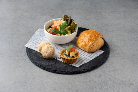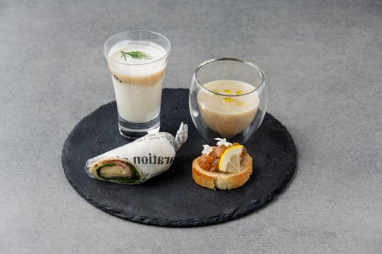 冬らしい世界観を表現し、ホワイトを基調としたセイボリー4種をご用意。「カリフラワーのムース コンソメジュレ」は、ふんわりと仕立てたカリフラワーのムースに旨味豊かなコンソメジュレを絡めることで、やさしい甘さとコクを感じていただけます。また、「鴨生ハムとルッコラのトルティーヤ」は濃厚なチーズのコクが生ハムと調和し、鴨の旨味を一層引き立てます。