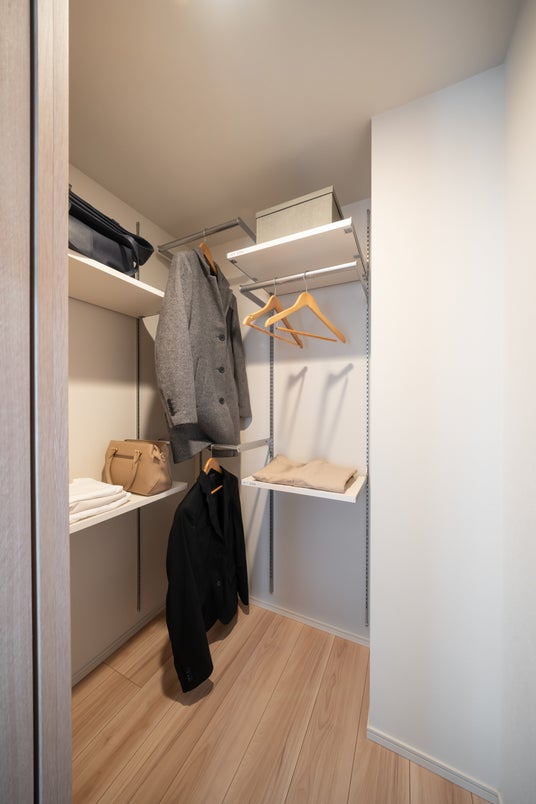 例えば、フレキシブルな棚板・パイプを設置したウォークインクローゼット、鏡裏にコンセントや細かい収納に便利なフックを備えた洗面室内の鏡裏収納付三面鏡など、利便性を追求した設備を導入。また、2LDKのプランは、スタイリッシュなマントル型のレンジフードを取り入れたキッチンや収納量が豊富な食器棚を設置しています。