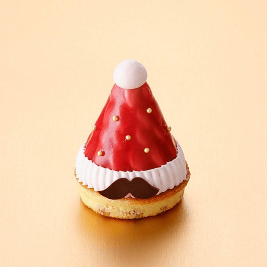 くるみ入りの生地の上に、甘酸っぱいラズベリーのムースとゼリーを重ね、生クリームを合わせました。おヒゲがキュートなサンタさんの帽子をイメージしています。