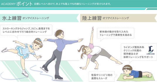 『西武フィギュアスケートアカデミー東大和』では、これまで培ってきたスケート事業の実績と充実した施設環境を活かし、世界で活躍しているスケーターの育成経験を有するインストラクターを招聘し、実践で培われたノウハウをもとに、世界基準の技術と表現力を学べる環境を整えるとともにメンタル面まで含めた総合的なサポートを実現します。そのほかグループの強みを活かし、一般社団法人ARMSが運営する「ライオンズ整形外科クリニック」と連携して「オフアイストレーニング」を導入します。