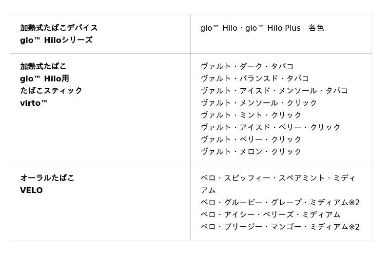 8Fのラウンジにて、glo(TM)の加熱式たばこ専用デバイス「glo(TM) Hilo シリーズ」やオーラルたばこ「VELO」をはじめとする各種製品(下記表参照)のトライアルが可能です。