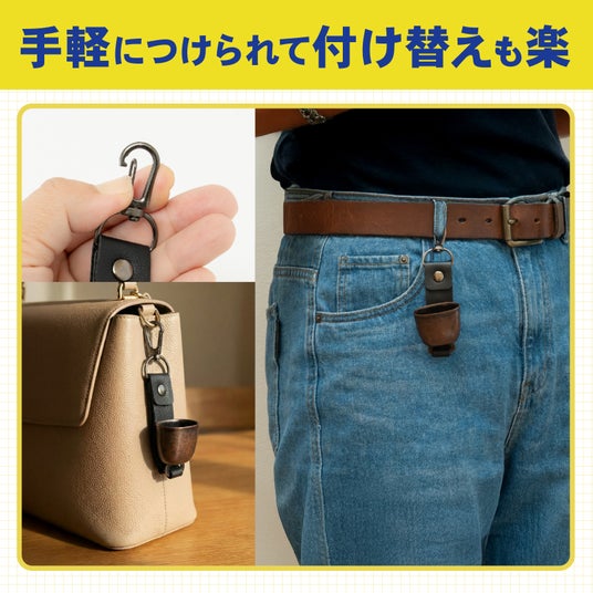 ナスカンを採用しているため、リュックやバッグ、ベルトループなどさまざまな場所への着脱がスムーズに行えます。ワンタッチで簡単に取り付け・取り外しができ、使いたいときに素早く対応できるのが特徴です。