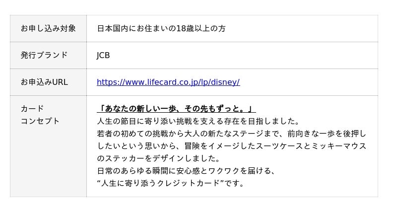 株式会社ジェーシービー (本社:東京都港区、代表取締役会長 兼 執行役員社長:二重 孝好、以下:JCB)とライフカード株式会社(本社:東京都中央区、代表取締役社長:増井 啓司、以下:ライフカード)は、「ライフカード(ディズニー・デザイン)」と「ライフカードゴールド(ディズニー・デザイン)」の申し込みを2025年12月22日(月)より開始します。