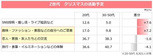 Z世代では、「恋人・家族らの交流」や「旅行・食事などの体験」といった従来型のクリスマスの過ごし方は30~50代をわずかに下回りました。一方で、「趣味・ファッションなどの自分へのご褒美」や「SNS投稿・推し活など」の活動は30~50代の倍程度にのぼっています。
