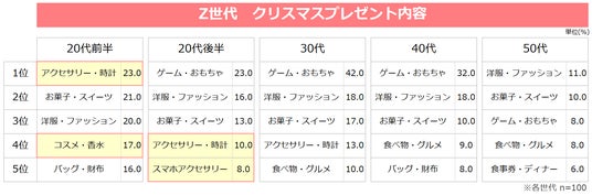 20代前半では「アクセサリー・時計」「コスメ・香水」など、日常的に身につけるアイテムが目立ち、20代後半では「スマホアクセサリー」など実用的なアイテムも選ばれています。一方、30代以上では「ゲーム・おもちゃ」が突出して高く、子ども向けプレゼントが中心となっている点がZ世代との大きな違いです。