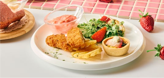 ・フィッシュアンドチップス 苺タルタルソース添え:イギリスのソウルフードであるフィッシュアンドチップスに、いちごを加えた美しいピンク色のタルタルソースを添えました。クラシックなメニューにモダンな遊び心を加えた一品です。