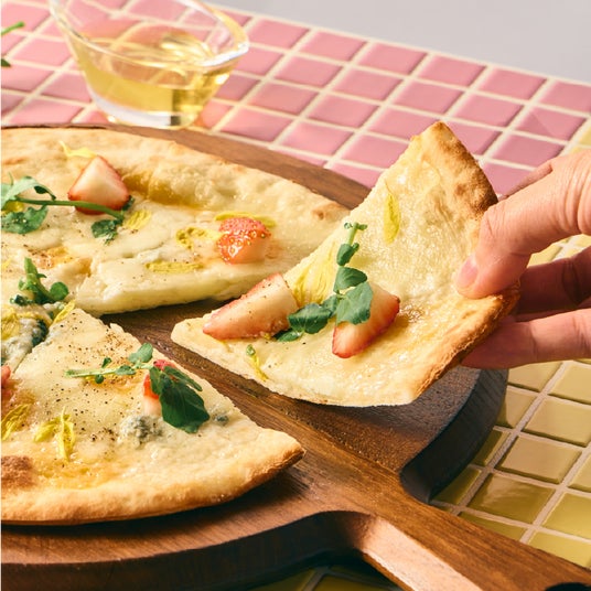 ゴルゴンゾーラ、モッツァレラを含む4種のチーズといちごを贅沢に使用し、香ばしく焼き上げたピザです。チーズの豊かな塩気と、熱が加わり甘みが凝縮された温かい苺の甘みが絶妙に溶け合う、甘じょっぱい新感覚の一品。お好みで蜂蜜をかけて、さらに奥深いハーモニーをご堪能いただけます。