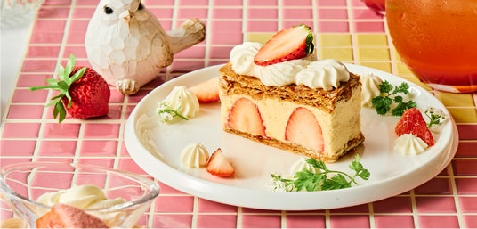 ・ストロベリーカスタードスライス:ほろ苦いパイで、クレーム・ムースリーヌといちごをホールでサンドしました。クレーム・ムースリーヌは、 濃厚なカスタードクリームにバタークリームを合わせた、コクがありながらも軽い口溶けが特徴のクリームです。イタリアンメレンゲを使用することで、軽やかな口当たりを実現。カットしたいちごの断面の美しさにもご注目ください。