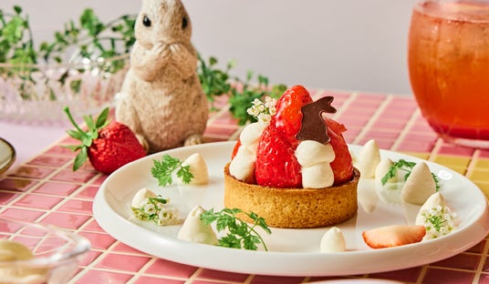 ・イースターガーデンストロベリータルト:王道のストロベリータルトに、愛らしいイースターバニーをデコレーションした繊細でクラシカルなスイーツ。さくさくの生地にアーモンドクリームを流し込み、滑らかなカスタードクリームとたっぷりのいちごを載せました。お皿に飾っているエディブルフラワーと生クリームはガーデンを彷彿とさせ、庭でエッグハントをしている子うさぎを再現した、イースターならではの一皿です。
