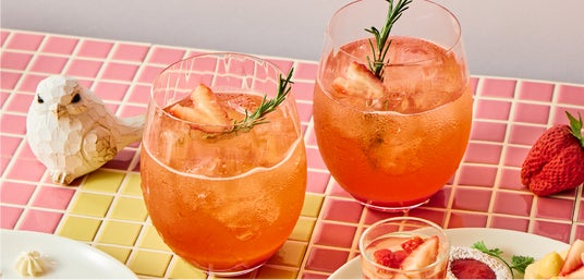 ・ストロベリーモクテル:フレッシュないちごシロップをスパークリングウォーターで割り、淡い色合いに仕上げました。スカッシュのような爽快感がありながら、グラスの縁にローズマリーを添えることで、モダンで優雅なティータイムに花を添えます。