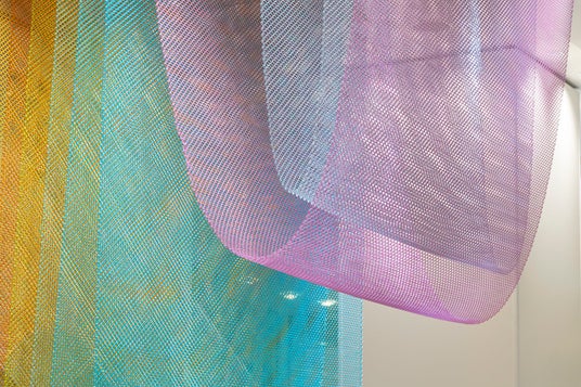 今年も、ナチュラルで落ち着いた素材の色彩を活かした展示から、色彩が華麗なインスタレーションまで幅広い展示が行われました。中でも色彩によって素材やプレゼンテーションの可能性を示し、見る人に印象を残した展示をご紹介します。共和鋼業+落合守征「金網の茶室」