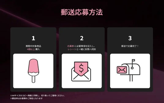 ※複数レシートの合算不可。対象商品4個分の購入が1枚のレシートで確認できるもの