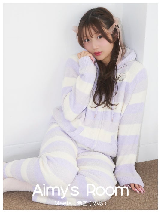今シーズンは、ふわふわで柔らかな「フェザーヤーン」のニット素材を使用したアイテムを展開。温かくて着心地も抜群なボーダー柄のプルオーバーやフルジップパーカー、ロングパンツのほか、ソックスがセットになった無地ショートパンツなど、冬のおうち時間にぴったりなラインナップです♪