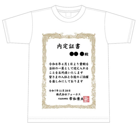 内定式当日は、新入社員一人ひとりの紹介をはじめ、フォーカスならではの「内定証書Tシャツ授与」、内定者代表による決意表明スピーチ、代表取締役・常松からのメッセージなどを実施しました。