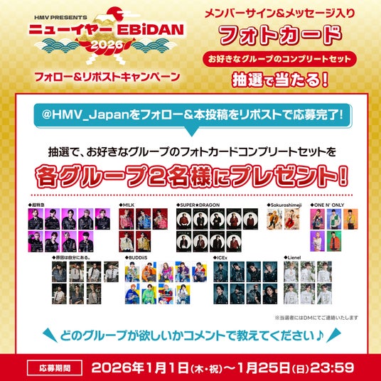 そして、昨年に引き続き開催が決定した、HMV PRESENTS “ニューイヤーEBiDAN 2026”では、2026年1月1日(木・祝)より全国のHMV店舗・HMV&BOOKS onlineや公式SNSを通じた8つのキャンペーンを実施!「EBiDAN」対象商品をお買い上げいただいたお客様へ「新春オリジナル メンバーサイン&メッセージ入りフォトカード」のプレゼントをはじめ、SNSキャンペーン、HMV店舗スタッフの「EBiDAN推しはっぴ」着用、対象店舗での「EBiDAN 絵馬風 コメントボード」「EBiDAN大型ディスプレイ」設置など、様々な企画を実施いたします。