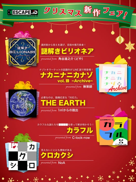 ESCAPE合同会社(本社:東京都品川区、統括プロデューサー 佐々木 翼)は、オンライン謎解き・脱出ゲームのポータルサイト『ESCAPE.ID GAMES』にて、新たに5つの新作ゲームを配信したことをお知らせいたします。