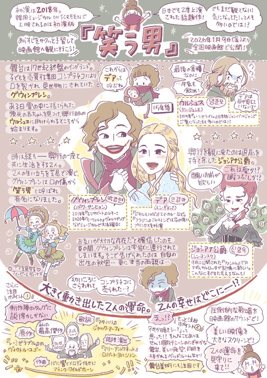 コミックエッセイ、体験レポート、イラストカットなど、幅広く活躍するイラストレーターの春原弥生が、『笑う男』の魅力をわかりやすくまとめた“あらすじイラスト”を制作。重厚な物語を親しみやすく描いた本イラストは、初めて作品に触れる人にも魅力が伝わる内容となっている。