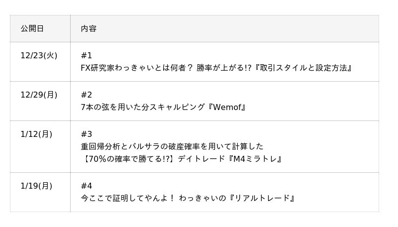 サンミュージック所属のお笑い芸人で、竹山さんの後輩にあたるわっきゃいさんですが、自身のFXの腕に絶対的な自信を持ち、「逆張りでの分スキャルピング」「順張りでデイトレード」の2つを実践しています。#1では、わっきゃいさんのこれまでの経歴から、FXとの向き合い方、トレードスタイルの概要を紹介していきます。わっきゃいさんの攻略法は、果たしてFX専門家軍団を納得させることができるのか、#2以降にもぜひご期待ください。