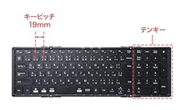 今回紹介する「Bluetooth折りたたみフルキーボード」は、キーピッチ19mm&テンキー内蔵の折りたたみ式フルサイズキーボードです。