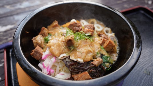 創業100年の源泉十割温泉が提案する“食べる温泉文化”。 ジューッと響く音、湯けむりに包まれる香り、別府式まぜちゃんぽん。