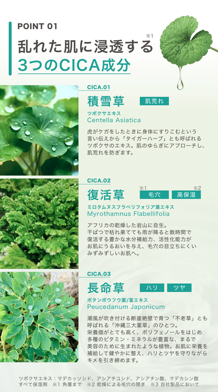 ツボクサエキスをはじめとして、復活草、長命草を加えた3つの植物エキスを「3つのCICA」成分として配合しています。