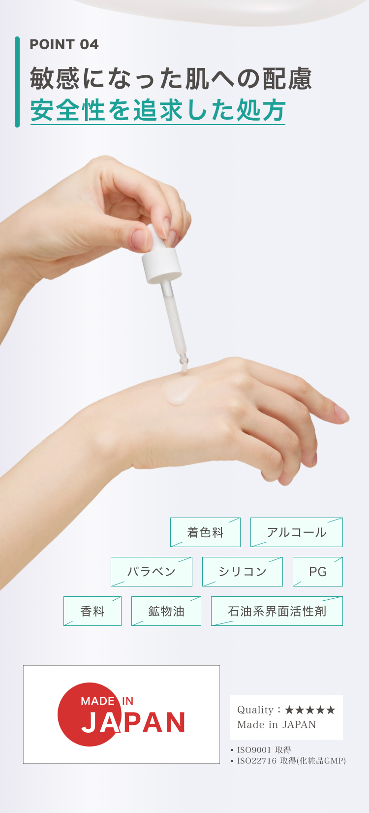 敏感になった肌に配慮し、安全性を追求した8つのフリー処方となっております。