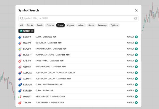 松井証券FXの全通貨ペアレートを、TradingViewのチャート画面上で直接閲覧可能。