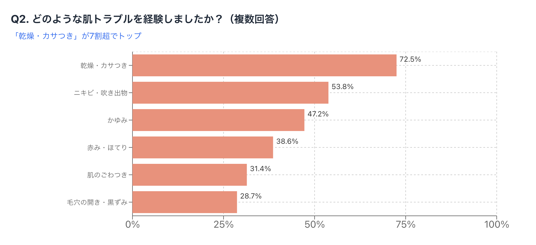 その結果、「乾燥・カサつき」が72.5%で最も多く、次いで「ニキビ・吹き出物」(53.8%)、「かゆみ」(47.2%)という結果になりました。