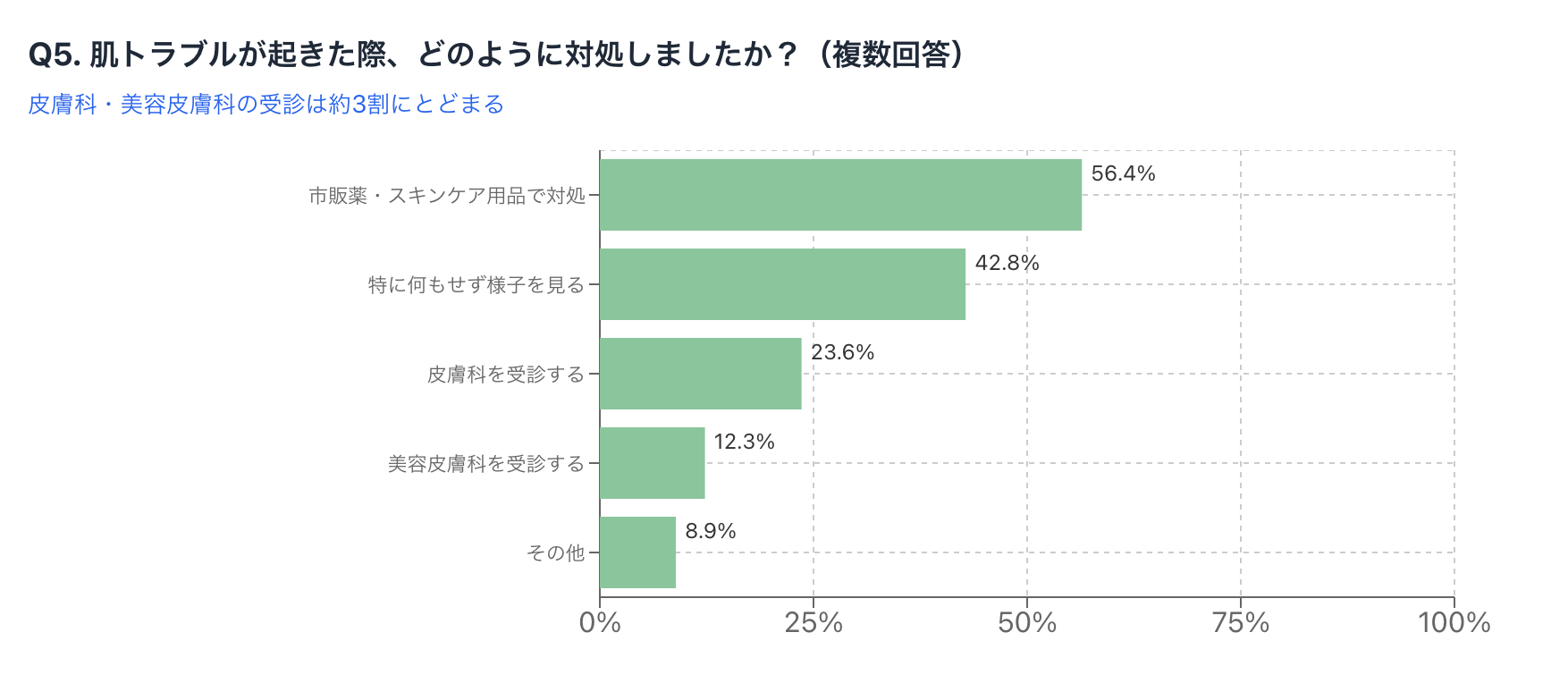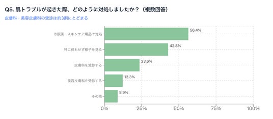 その結果、「市販薬・スキンケア用品で対処」が56.4%で最も多く、「特に何もせず様子を見る」(42.8%)が続きました。一方で、「皮膚科を受診する」は23.6%、「美容皮膚科を受診する」は12.3%にとどまり、専門家への相談が進んでいない実態が明らかになりました。