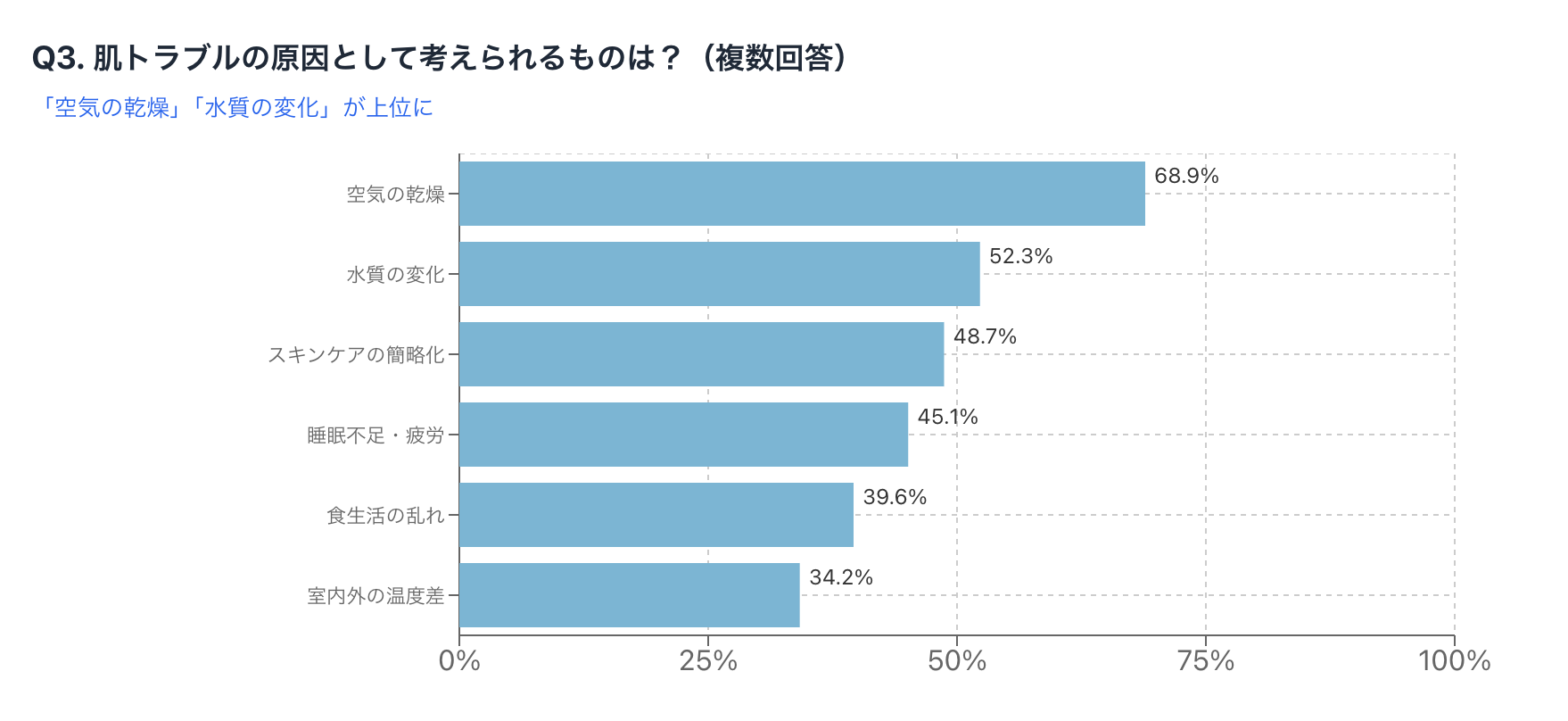 その結果、「空気の乾燥」が68.9%で最も多く、次いで「水質の変化」(52.3%)、「スキンケアの簡略化」(48.7%)という結果になりました。