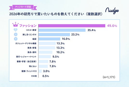 - 2026年の初売りで買いたいカテゴリは、「ファッション」「コスメ・美容」「推し活・エンタメ」「福袋」が上位となりました。