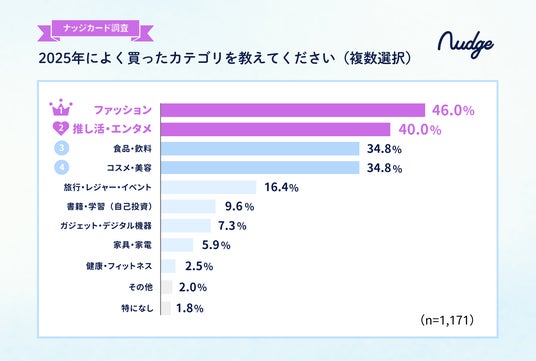 2025年に購入機会が多かったのは「ファッション」「推し活・エンタメ」2025年に購入機会が多かったカテゴリを尋ねたところ、「ファッション」が最も多く(46.0%)、次いで「推し活・エンタメ」(40.0%)という結果となりました。さらに「食品・飲料」(34.8.%)、「コスメ・美容」(34.8%)も上位に挙がっており、エンタメから日常品に関わる支出を中心に購入が行われている実態が明らかになりました。