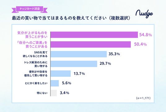 一方で、最近の買い物理由としては、「気分が上がるものを買う」(54.8%)「自分へのご褒美として買う」(50.4%)といった回答が多く、便利さや効率性よりも、気持ちの満足度を重視する傾向が見られました。