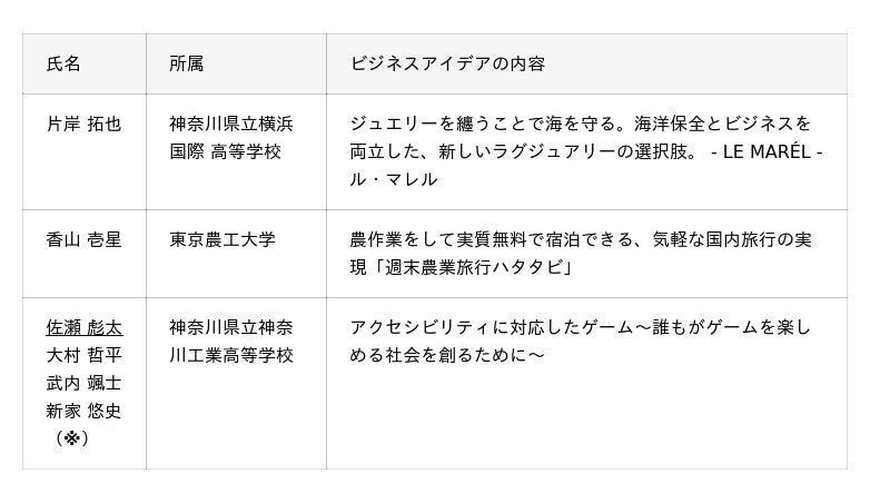 県では、多くのベンチャー企業の創出に向けて、起業の魅力を伝えることで、起業を将来の選択肢の一つとして捉えていただくため、学生を対象にした「かながわ学生ビジネスアイデアコンテスト」を開催し、受賞者を決定しましたので、お知らせします。