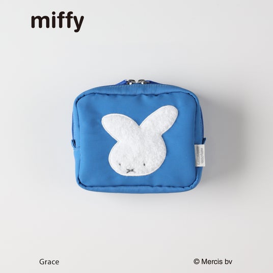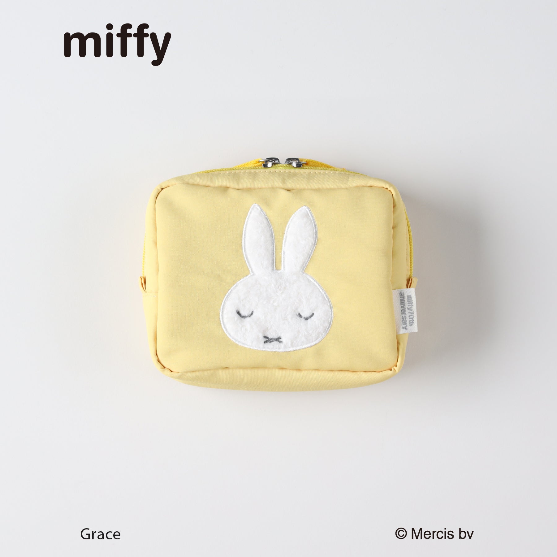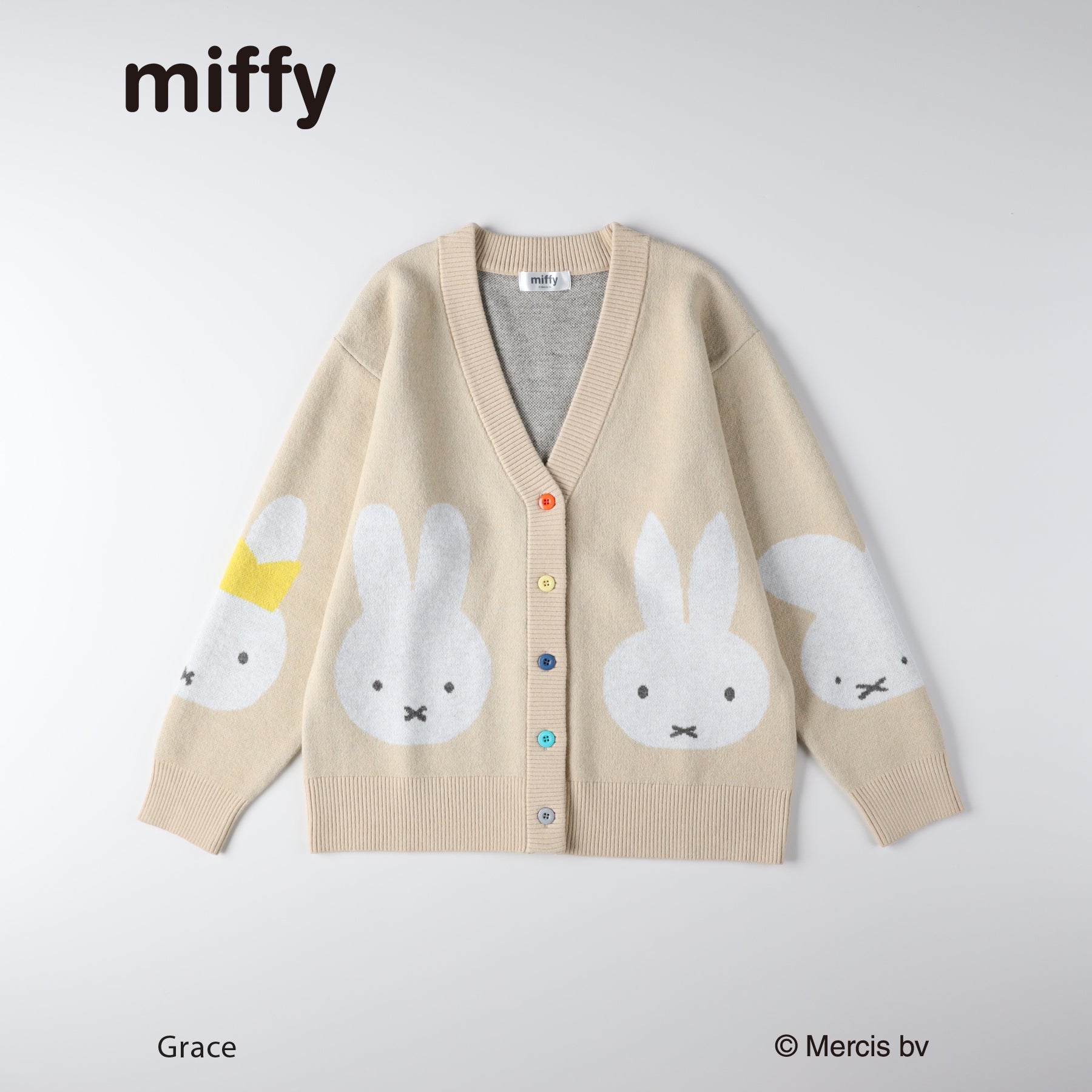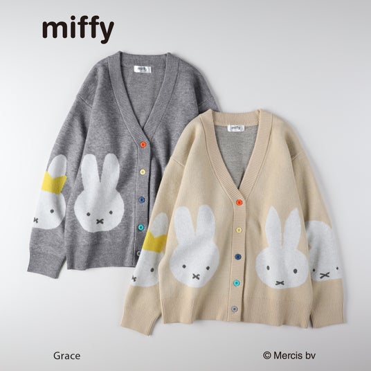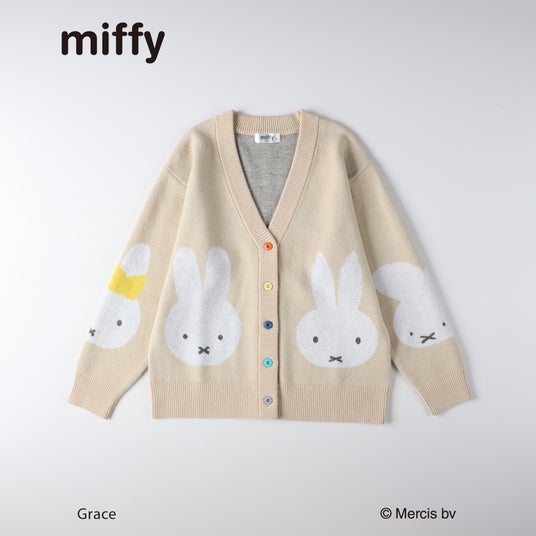 今回のコレクションは、さまざまな年代のミッフィーのお顔をあしらったカーディガン1型と、シュシュ、バッグ、ポーチのグッズ3種で構成されています。カーディガンは袖や前身頃に歴代ミッフィーを施し、ファンにはたまらない一着です。